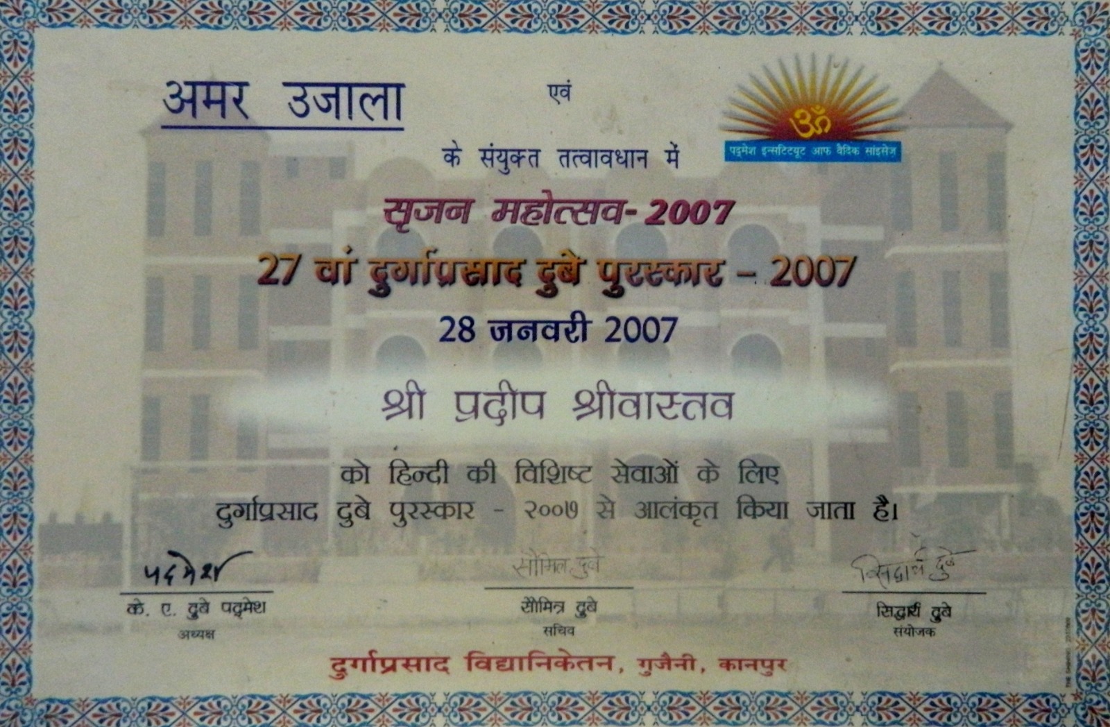 Received the 27th Durga Prasad Dubey Award (2007) by Amar Ujala, Kanpur and Padmesh Institute of Vedic Science.