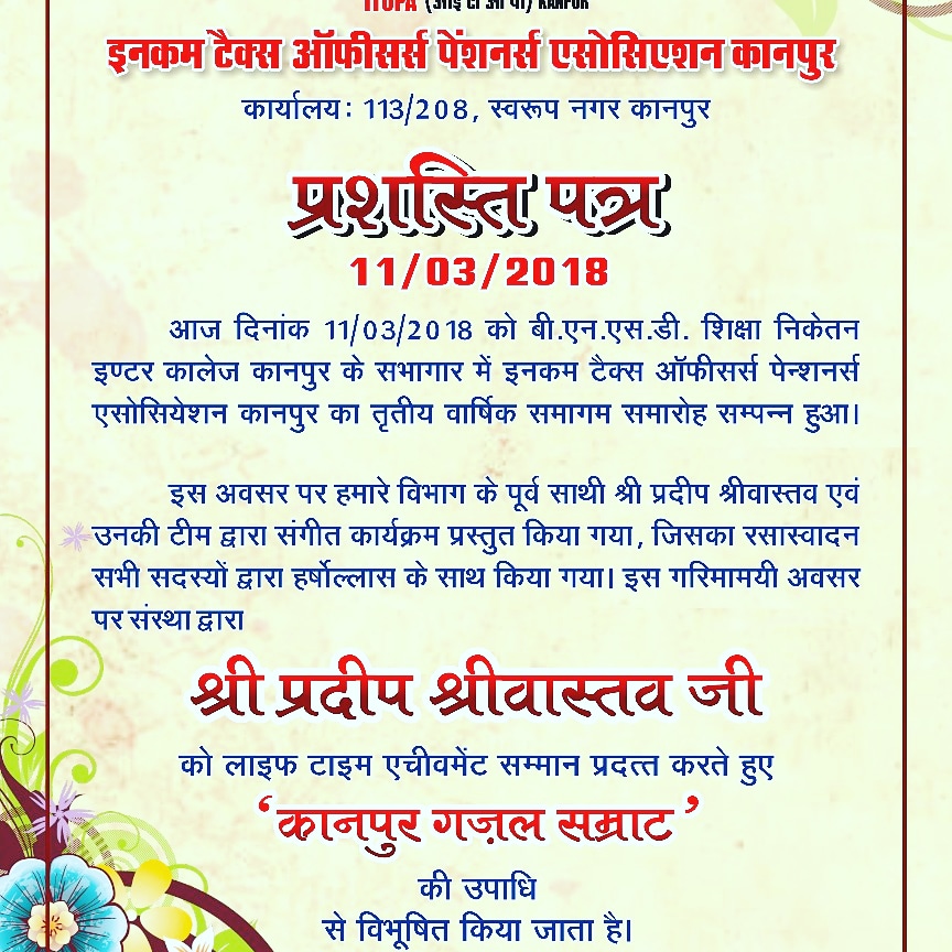 Lifetime Achievement Award by the Income Tax Officers Pensioners Association, Kanpur on 11.03.2018.
