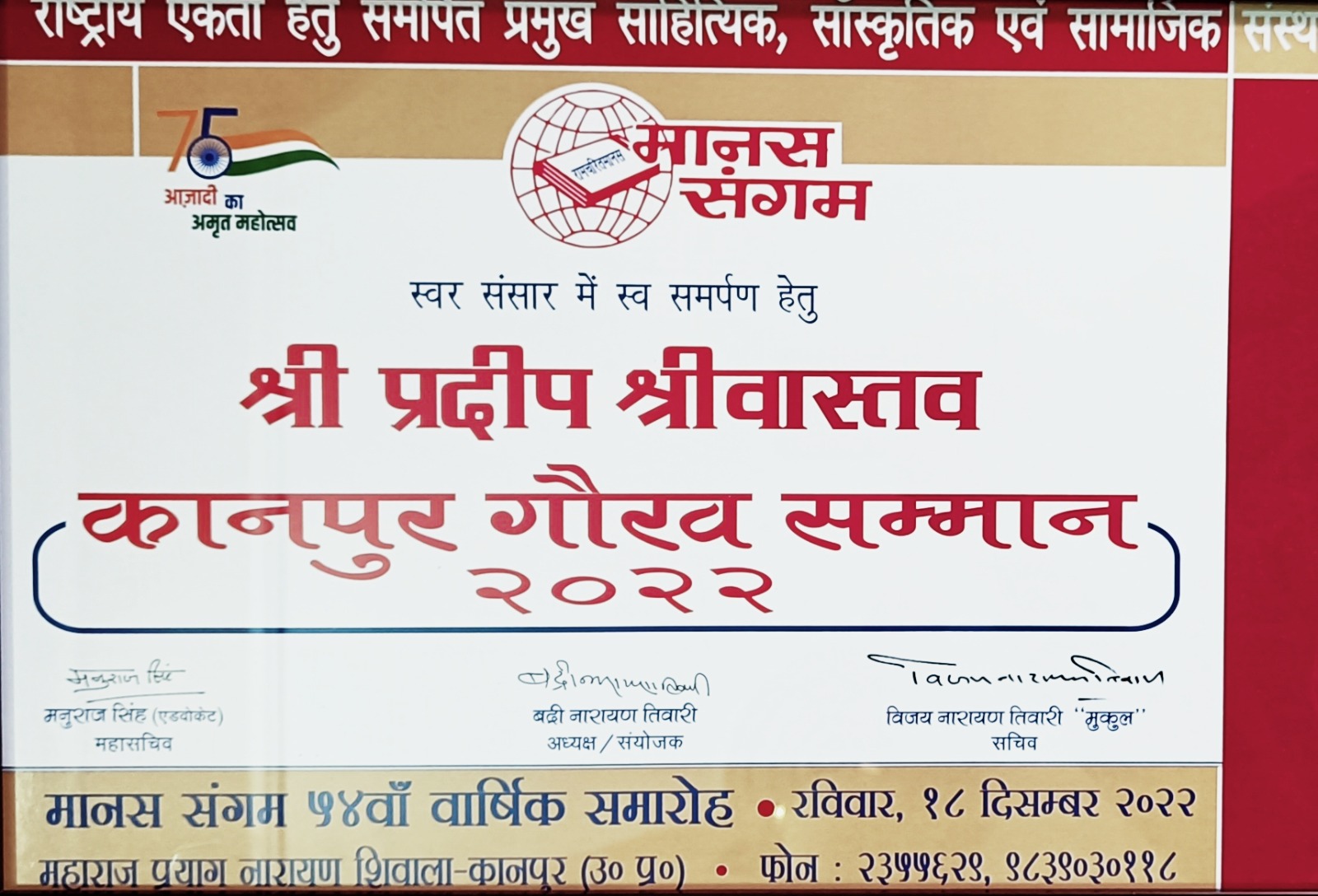 Kanpur Gaurav 2022 Award by Manas Sangam on 18-12-2022.